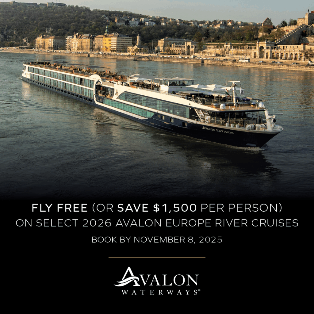 Enjoy FREE Round-Trip Airfare or Save $1,500 per person on select 2026 Europe river cruises! Choose from captivating itineraries like Magnificent Europe, Romantic Rhine, Grand France, Burgundy & Provence, Danube Dreams, Active & Discovery sailings, and more — all offering Avalon’s award-winning Panorama Suites with open-air balconies and immersive excursions. Book your dream European river journey by November 8, 2025, and take advantage of this incredible offer. Don’t miss your chance to explore Europe in style and comfort with Avalon’s signature small-ship experience.